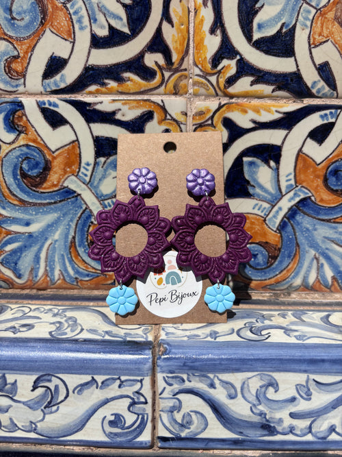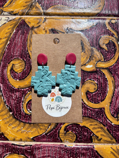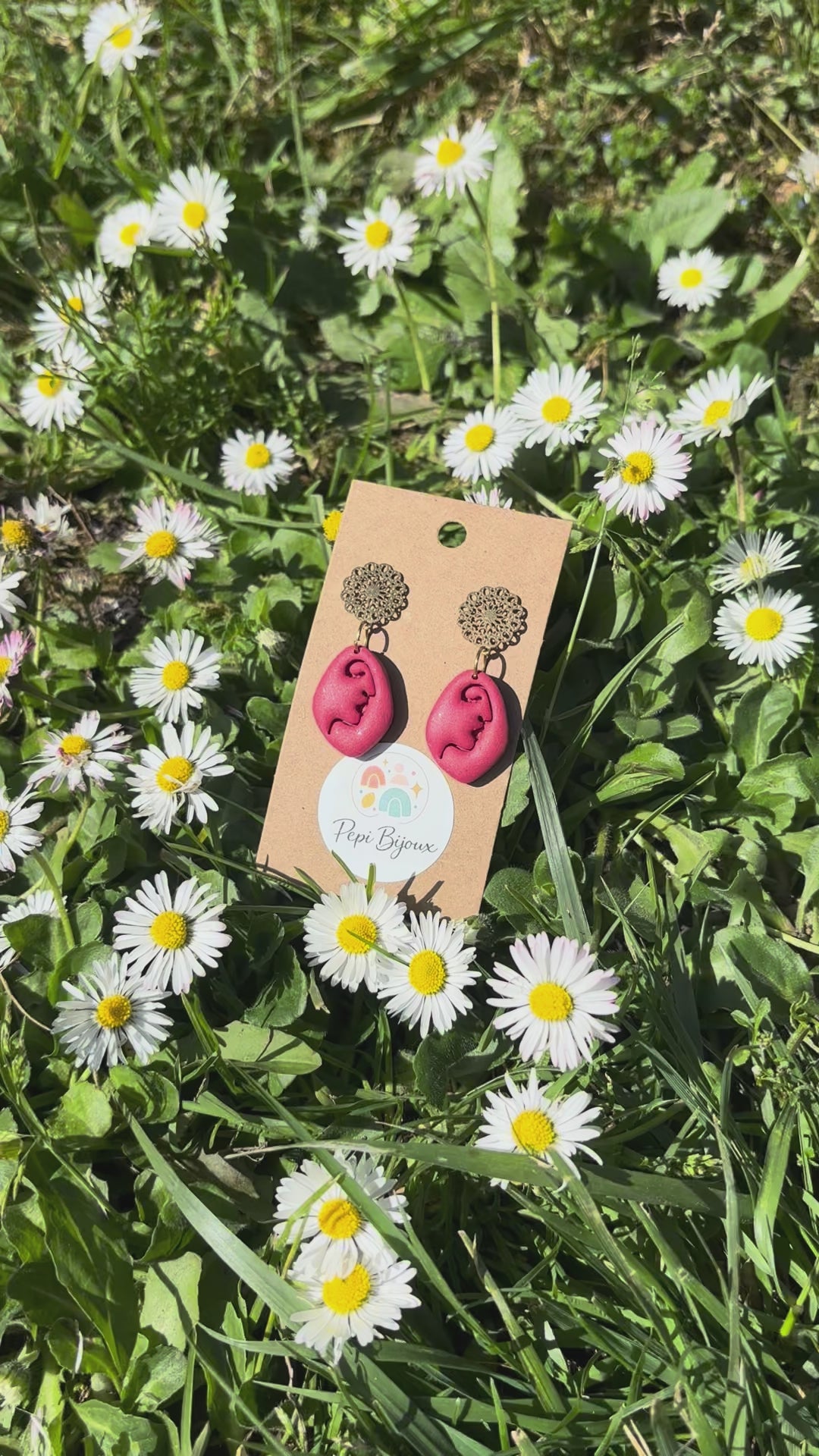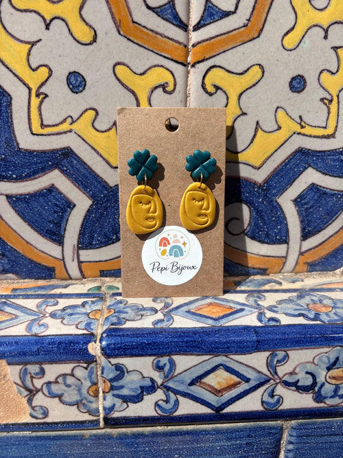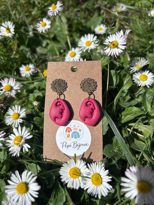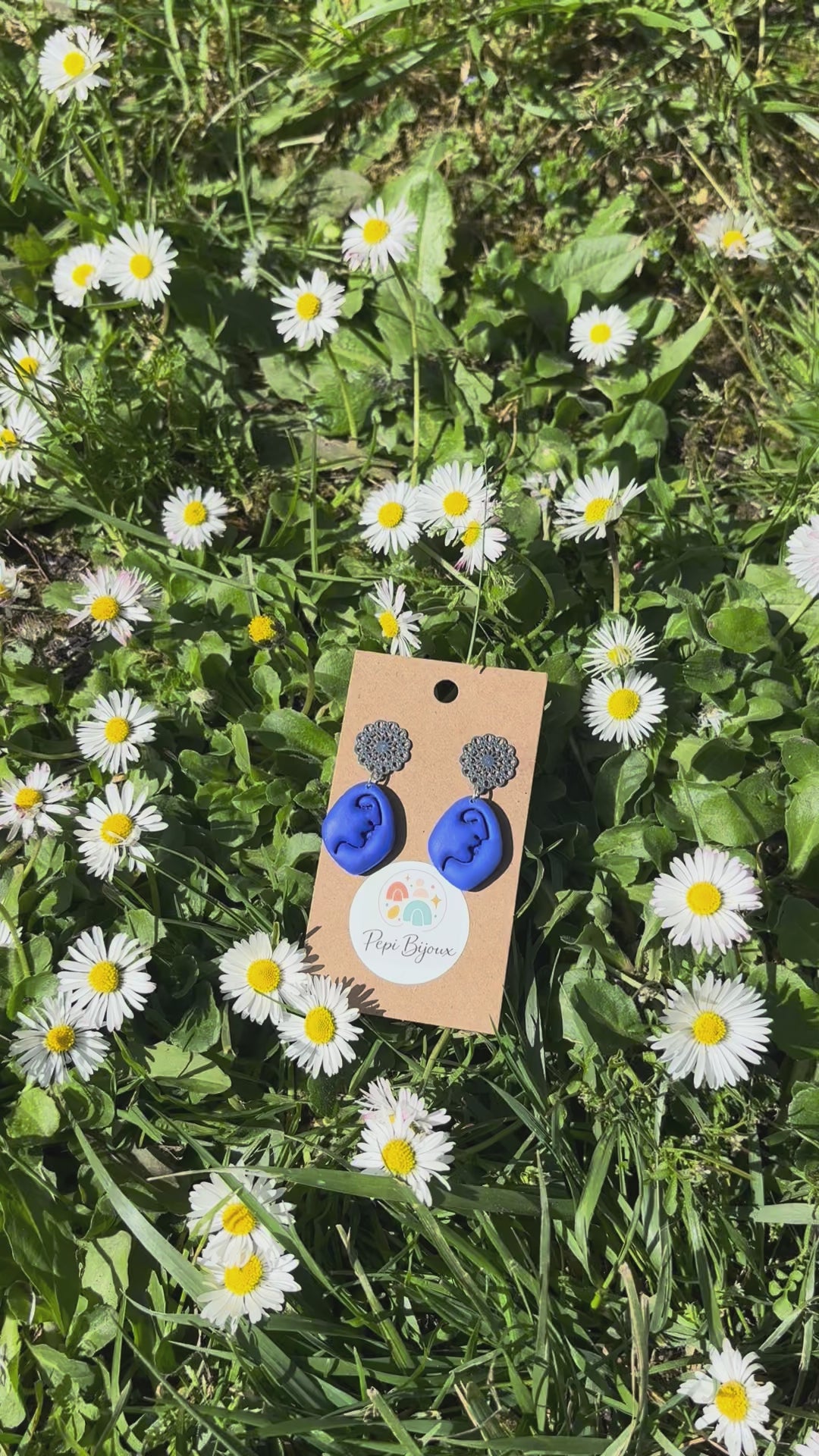 Un diseño moderno con una cara de mujer burdeos o azul de arcilla polimérica y un cierre dorado o plateado de acero inoxidable que no suele producir alergias.